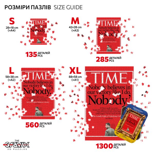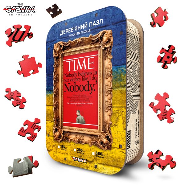 Обложка журнала TIME с Владимиром Зеленским и мощной цитатой “Nobody believes in our victory like I do. Nobody.” стала символом украинского духа по всему миру. Этот пазл — о храбрости, лидерстве и непоколебимой надежде.